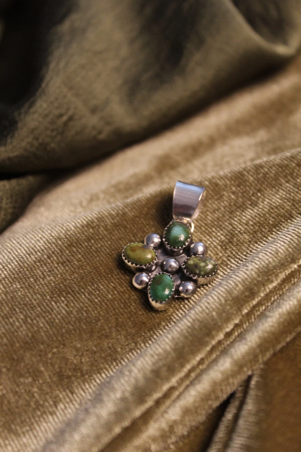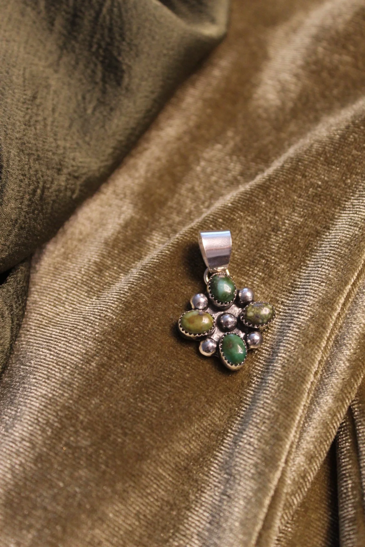 Image 1 of 2 Image 2 of 2 Clover Cluster Pendant $150.00 sold out Sonoran Gold Turquoise Native Made by Jaden Jesse Genuine Turquoise & Sterling Silver.Fits up to 6mm pearls Sold Out Added! Sonoran Gold Turquoise Native Made by Jaden Jesse Genuine Turquoise & Sterling Silver.Fits up to 6mm pearls